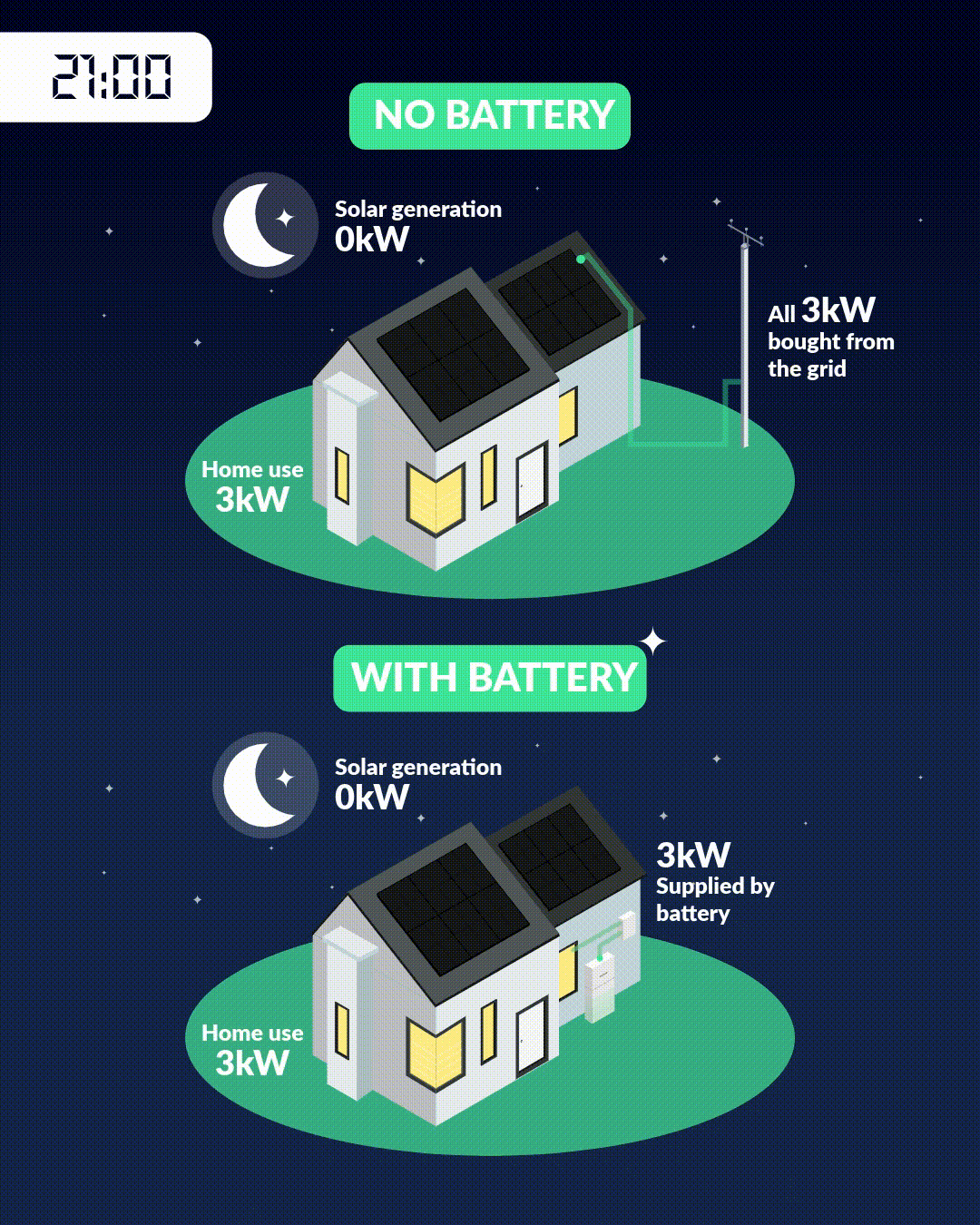 By installing a battery, excess solar energy is stored instead of being fed into the grid. At night, your home runs on stored solar energy, not expensive grid electricity.